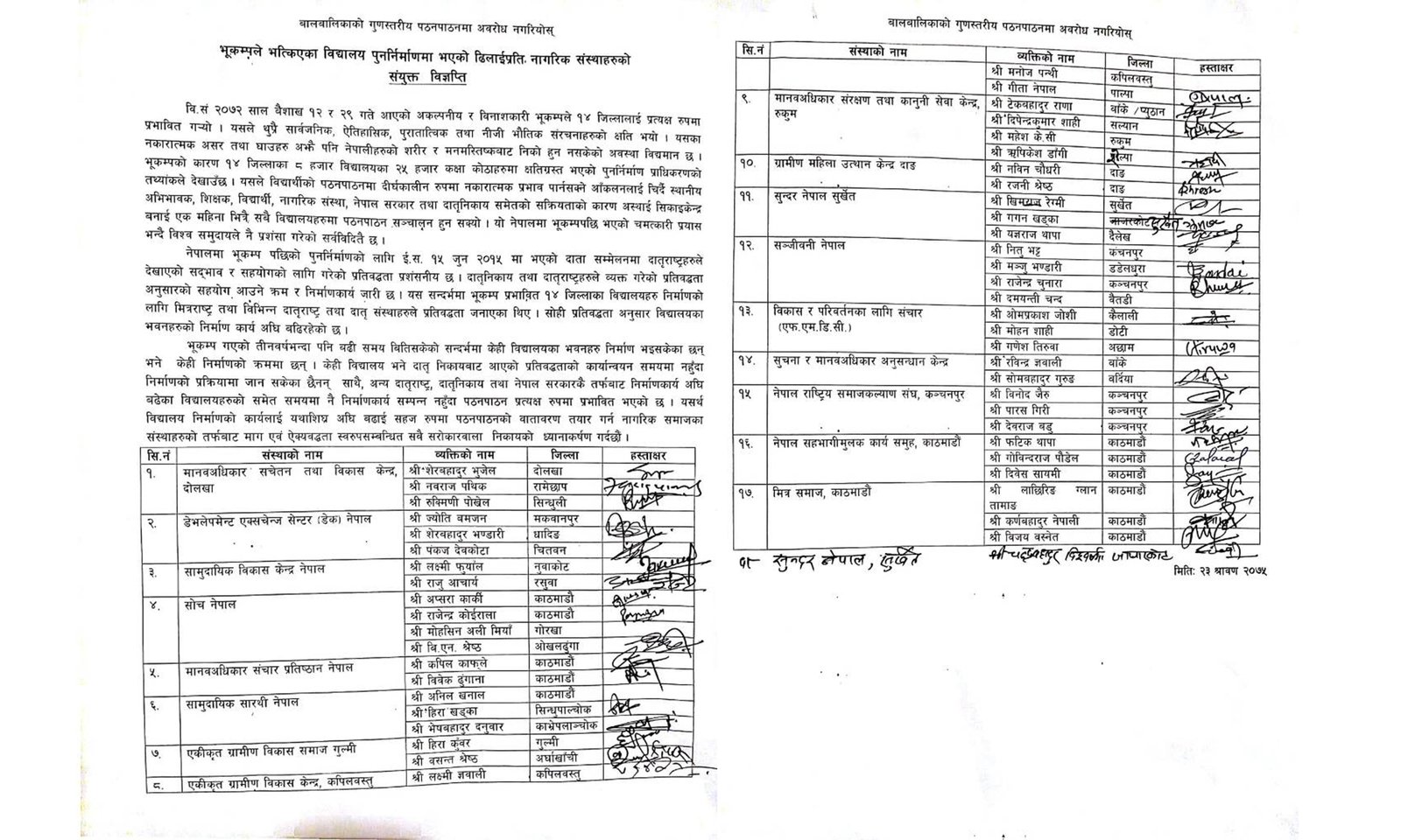 सोच नेपाल लगायत देशभरका १७ वटा नागरिक संस्थाका ३४ भन्दा बढी जिल्लामा क्रियाशिल अभियानकर्मीहरुले बुधबार संयुक्त विज्ञप्ति जारी गर्दै सो असन्तुष्टि जनाएका हुन् । नेपालमा २०७२ साल बैशाख १२ र २९ गते आएको अकल्पनीय र विनाशकारी भूकम्पले १४ जिल्लाका ८ हजार विद्यालयका २५ हजार कक्षा कोठाहरुमा क्षतिग्रस्त भएका भएका थिए । भूकम्प गएको तीन वर्ष बितिसक्दा पनि विद्यालयको पुननिर्माणको काम आशातित रुपमा अघि नबढेको भन्दै उनीहरुले विज्ञप्तिमार्फत ध्यानाकर्षण जनाएका हुन् ।