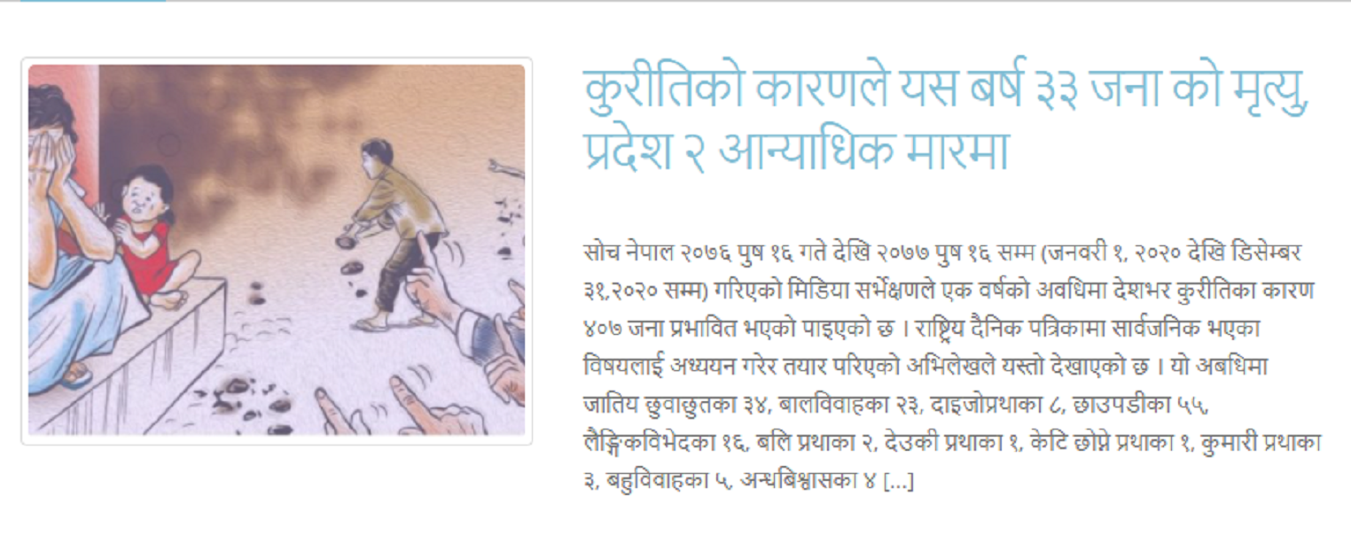 SOCH Nepal is constantly monitoring the issues of Kurities in Nepal published in printed and online media. Those events of Kurities are recorded in a format. Based upon those monitoring SOCH Nepal publishes the quarterly report on Kurities and their effect in Nepal. The report is well recognized by national and international agencies. UN has well recognized SOCH Nepal’s findings in its UPR reports.